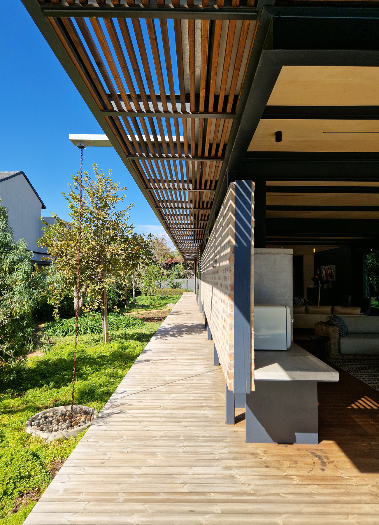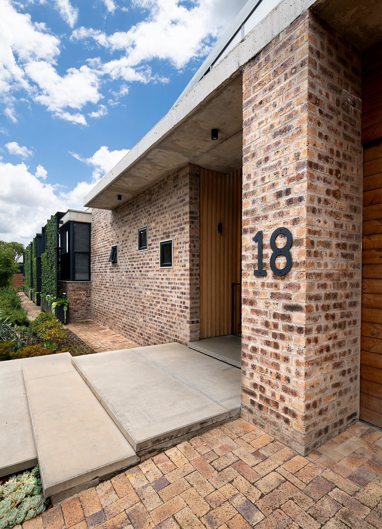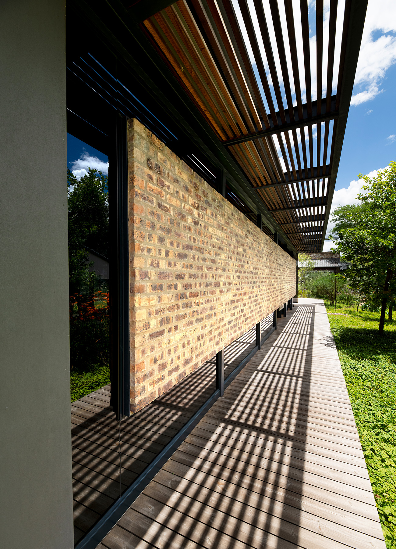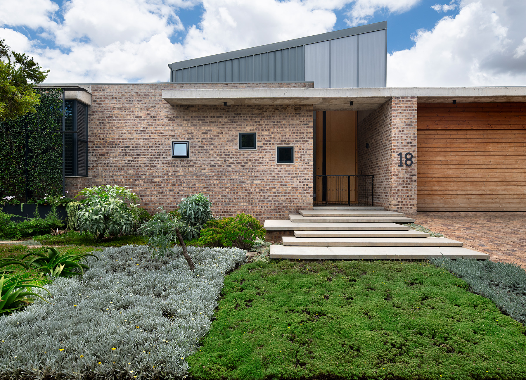 The site presented itself as somewhat flat and boxed-in within a residential estate. The plan and site allowed for the creation of three courtyards and a large open space in front of the house. We made the deliberate decision not to erect a wall or fence along the southern street front, allowing for a spacious, open landscape area. The southern facade of the house serves as the street-facing wall, adorned with planted screens and a few strategically placed openings. An inviting entrance is curved into the wall to greet visitors from the street. A 1:5 volume space serves as the main circulation area between the living area and the bedroom wing. Natural light floods the space through eastern clerestory windows constructed of a multi-wall polycarbonate system. The larger volume of the space features laminated spruce beams and a spruce plywood ceiling, creating a warm and inviting atmosphere. The volume of the other spaces boasts a horizontal roof that appears to float over the brick wall and glass facade.