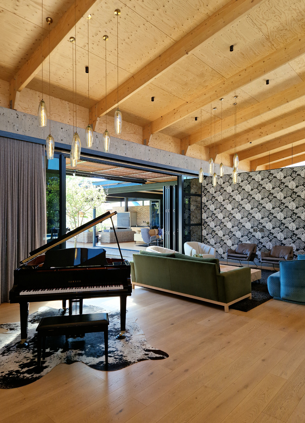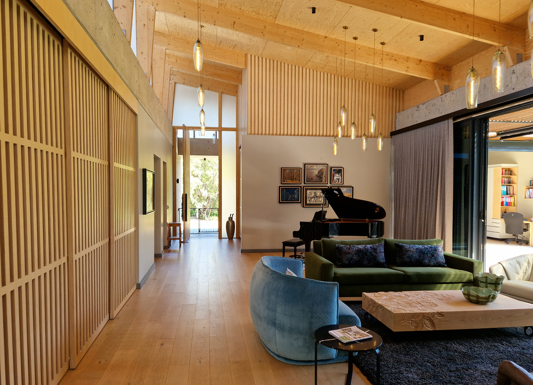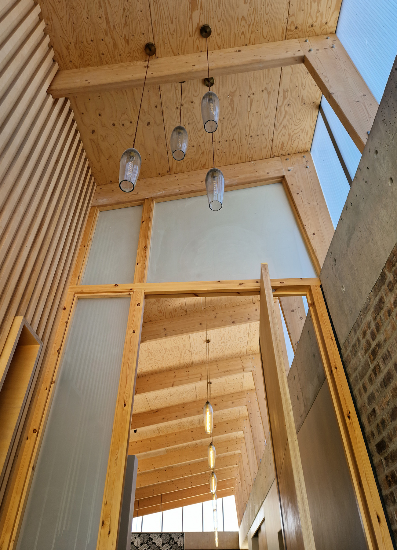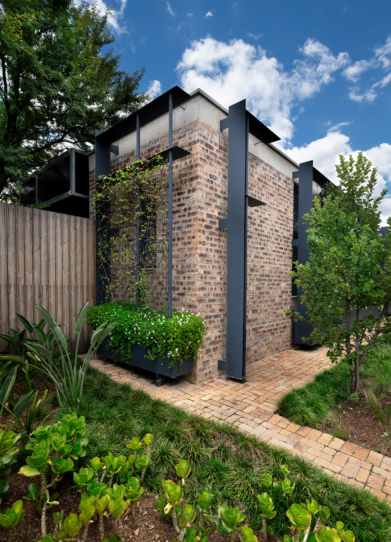 The site presented itself as somewhat flat and boxed-in within a residential estate. The plan and site allowed for the creation of three courtyards and a large open space in front of the house. We made the deliberate decision not to erect a wall or fence along the southern street front, allowing for a spacious, open landscape area. The southern facade of the house serves as the street-facing wall, adorned with planted screens and a few strategically placed openings. An inviting entrance is curved into the wall to greet visitors from the street. A 1:5 volume space serves as the main circulation area between the living area and the bedroom wing. Natural light floods the space through eastern clerestory windows constructed of a multi-wall polycarbonate system. The larger volume of the space features laminated spruce beams and a spruce plywood ceiling, creating a warm and inviting atmosphere. The volume of the other spaces boasts a horizontal roof that appears to float over the brick wall and glass facade.