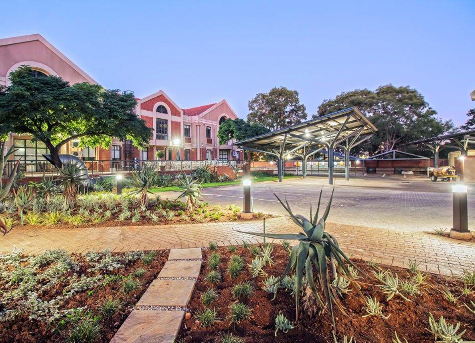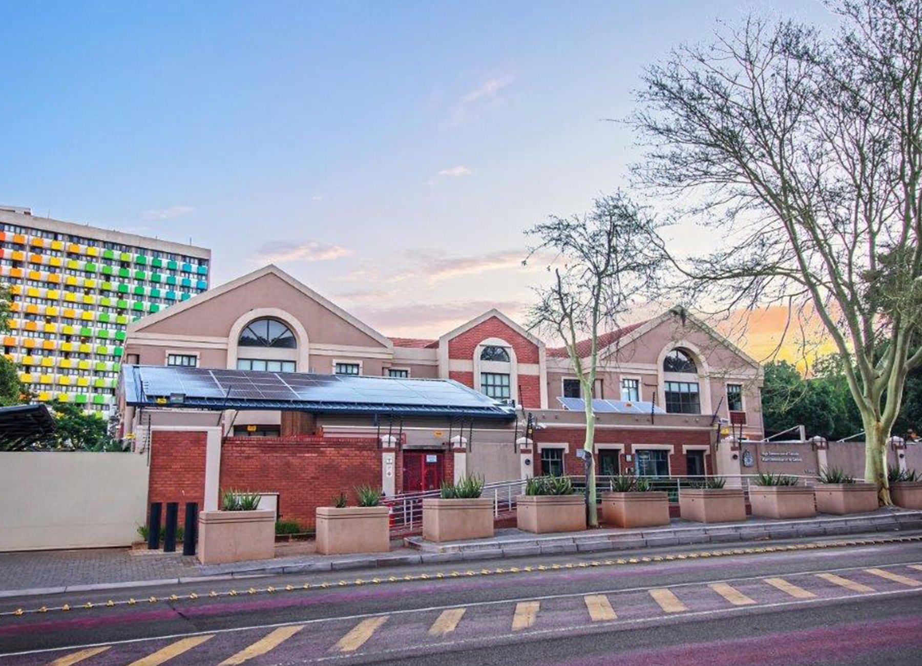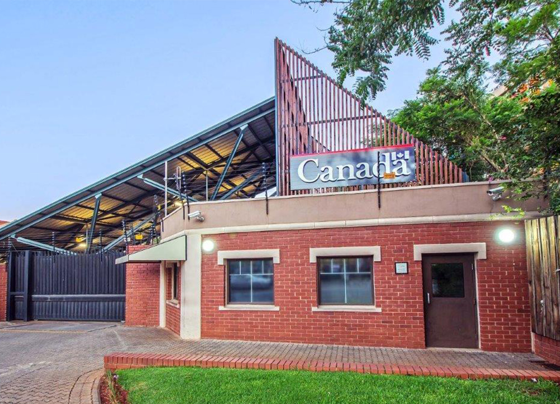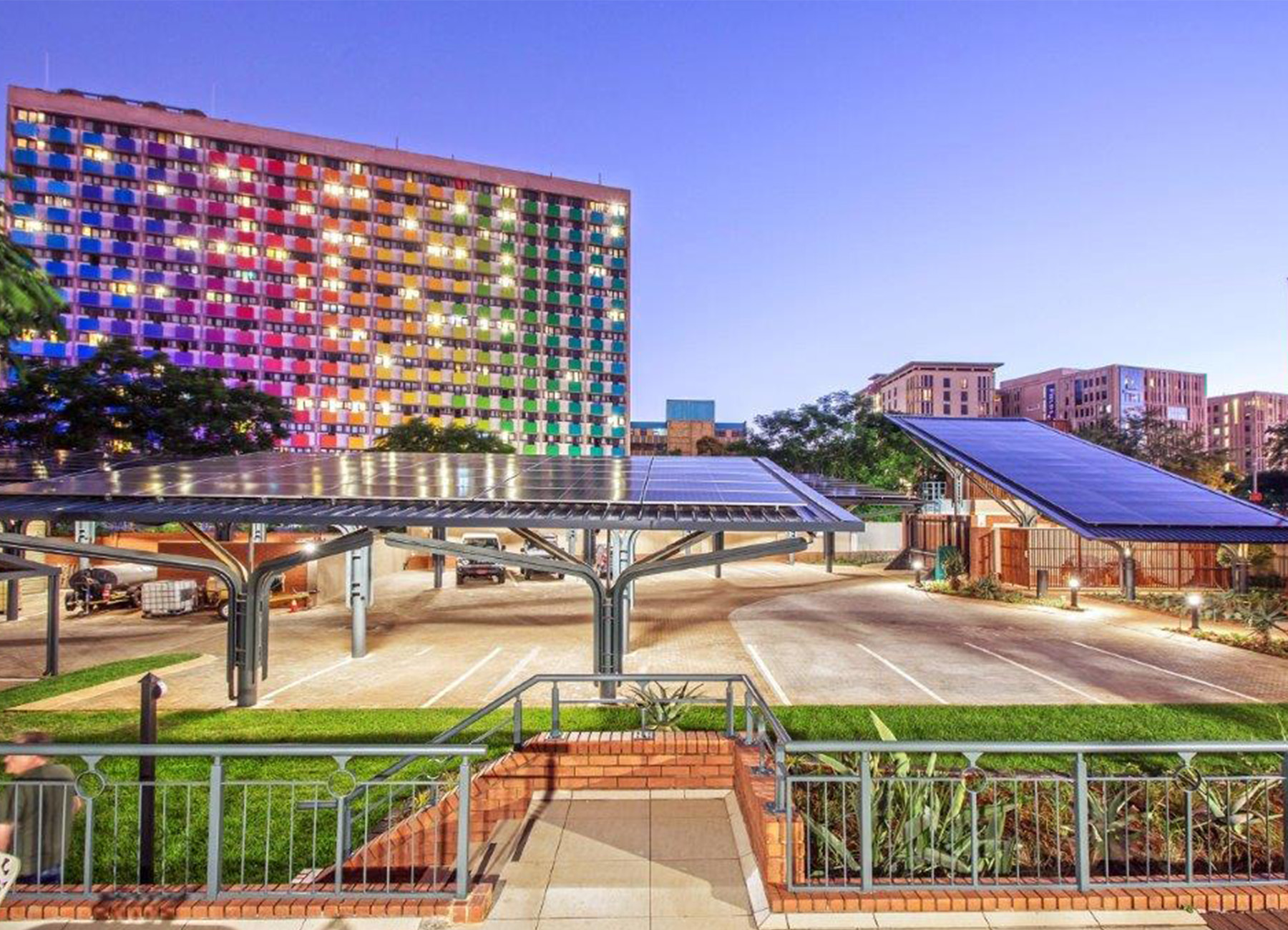 One such project is a microgrid system designed for an embassy, which integrates new photovoltaic panels and inverters with the existing power infrastructure, including backup generators. To house the solar panels, a series of steel carport roofs were designed. These structures take the form of stylized, tree-like steel frames, offering both structural efficiency and architectural expression. The result is a solar installation that is not only functional but also visually symbolic of growth, sustainability, and innovation.